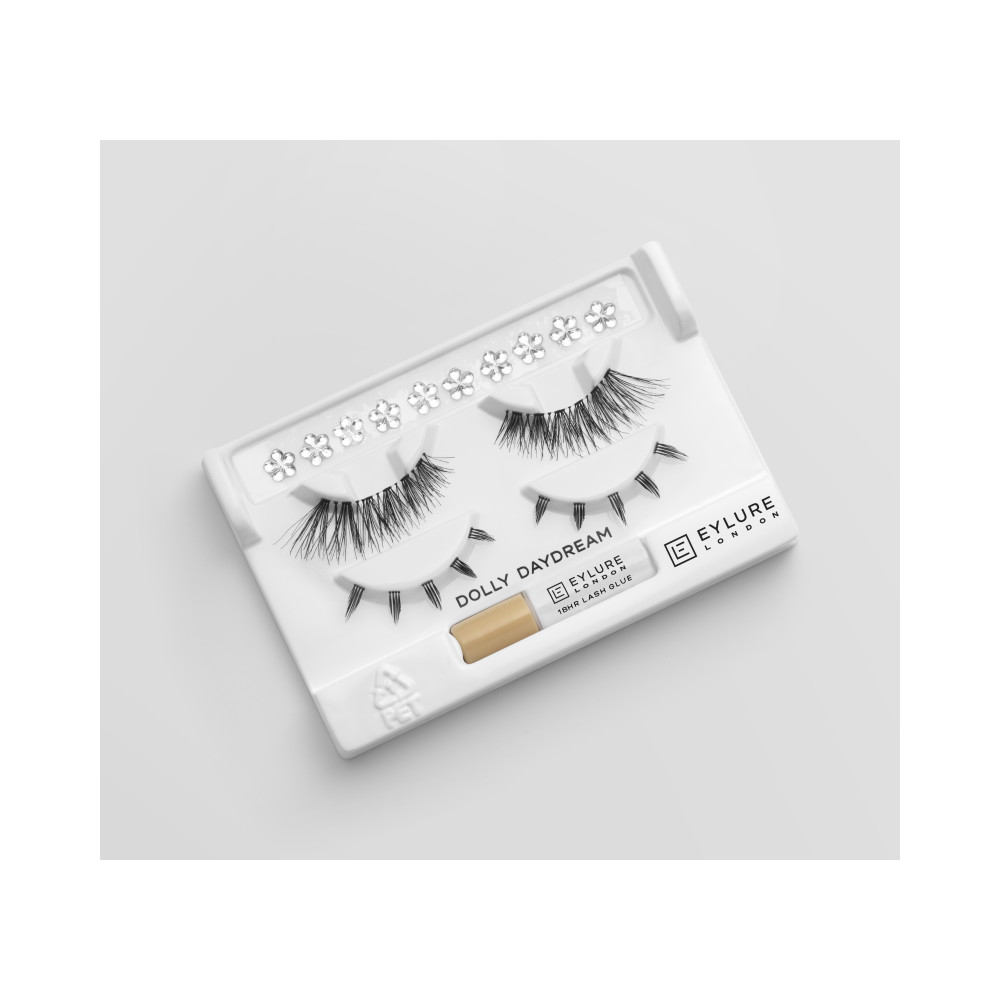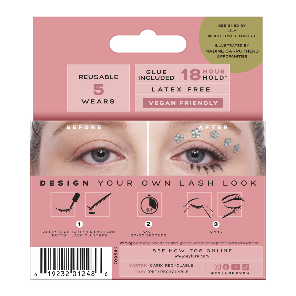Your lashes, your moment! Introducing one of our Eylure X you winners lashes for 2024. The Dolly Daydream Lash was designed by Lily (@Lilysloveofmakeup). The gorgeous pack was Illustrated by Nadine Carruthers (@Profanities) Dolly Daydream is the perfect wispy 3/4 length lash inspired by 1960s flower power. The set includes 10 bottom lash clusters and 10 silver flower adhesive gems for a playful, retro-inspired look. Handmade and reusable for up to 5 wears, each lash pack comes with our latex-free lash glue for a secure hold that lasts up to 18 hours.